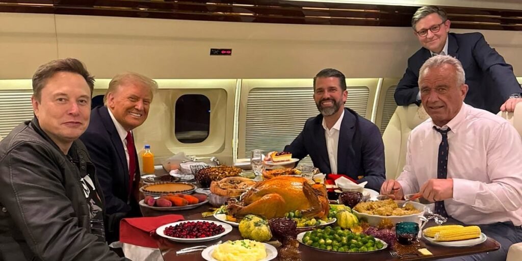 RFK Jr., parodying his famed photo dining on McDonald’s with President Donald Trump, Donald Trump, Jr., and Elon Musk, swapped the Happy Meals for Brussels sprouts and cranberries. Alex Jones appeared to cook a turkey with Sydney Sweeney. Crypto influencer Tiffany Fong carved hers next to Jackie Chan with the help of AI.