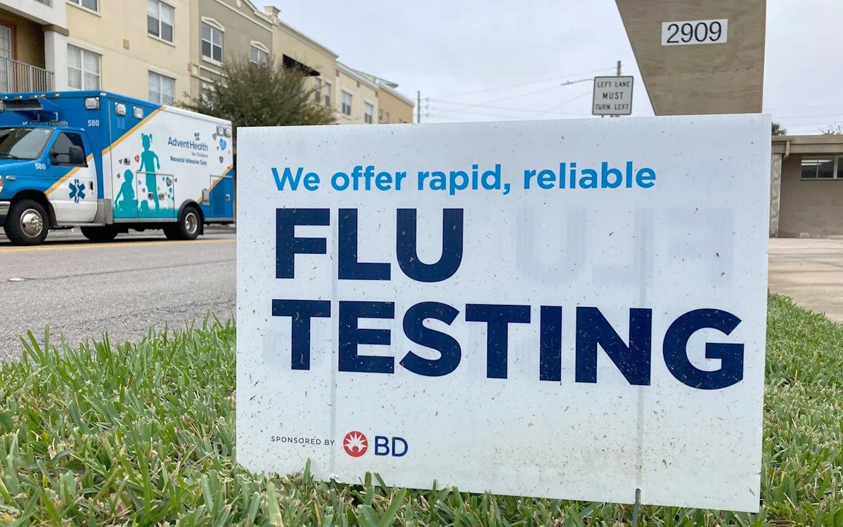 Paul Hennessy/SOPA Images/LightRocket via Getty Images – PHOTO: A sign advertising flu testing is seen in front of a pharmacy in Orlando, Fla.
