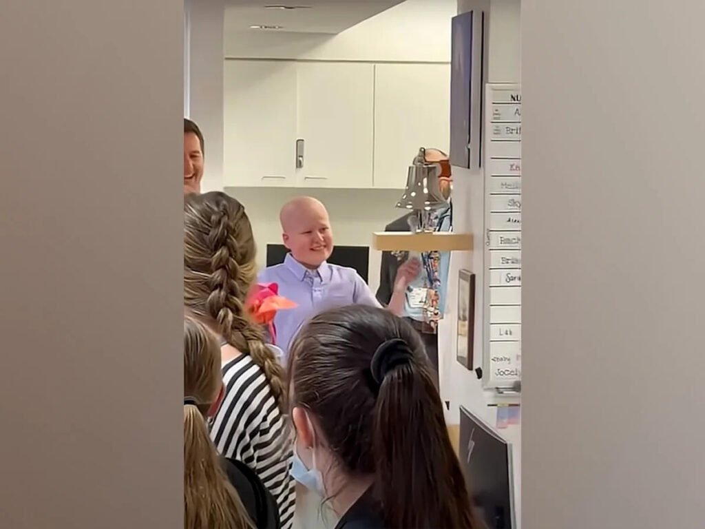 In the video, as Evan rings the bell, family members, friends and hospital staff cheer him on and give him high-fives and hugs.