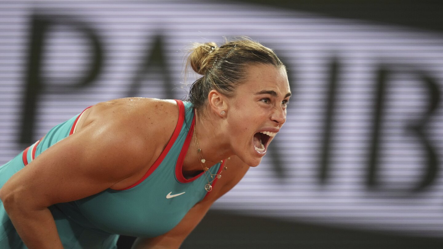 PARIS (AP) — Flecks of rust-colored clay dotted Aryna Sabalenka’s back and caked her white shoes as she ripped big shot after big shot against Iga Swiatek on Thursday, the thud of racket-on-string reverberating off the closed roof at the main stadium at Roland Garros.