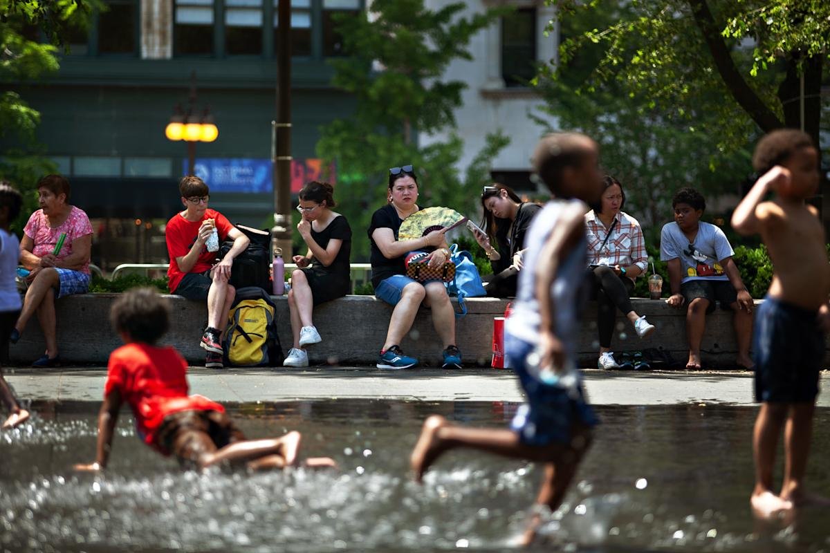 Vincent D. Johnson/Xinhua via Newscom – PHOTO: People sit in the shade as children play with water in downtown Chicago on June 14, 2022.