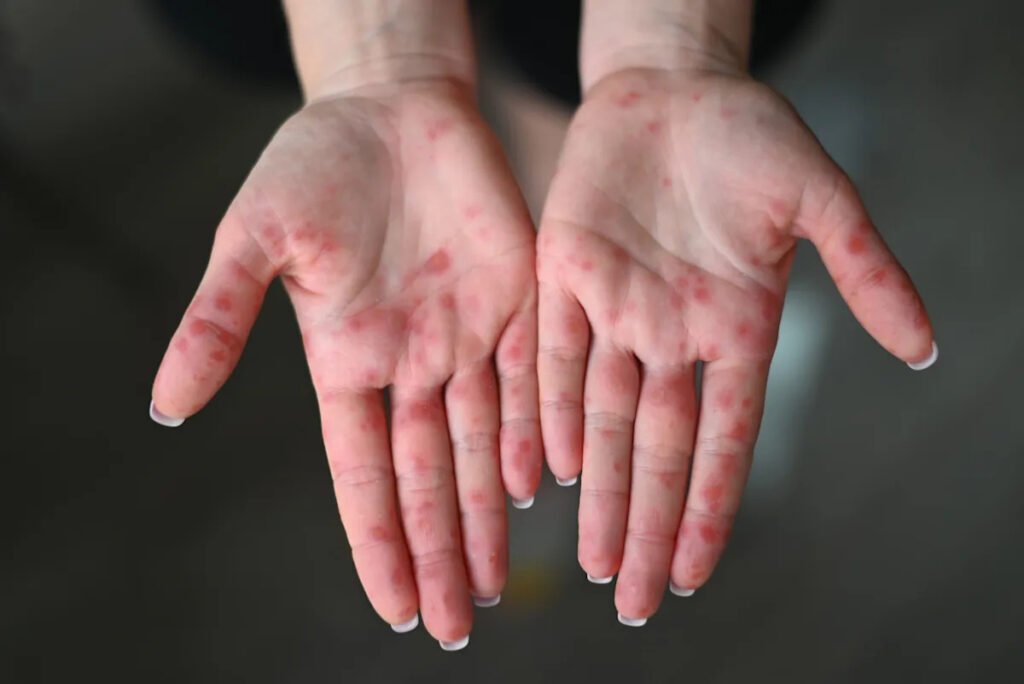Yaroslav Litun/Getty Images – PHOTO: Close-up of human palms showing hand-foot-mouth disease symptoms.