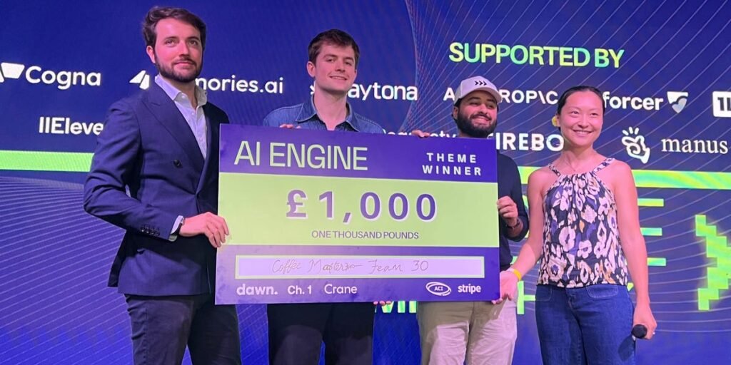 Alexander Cobb, second to left, holding a prize at the AI Engine hackathon.