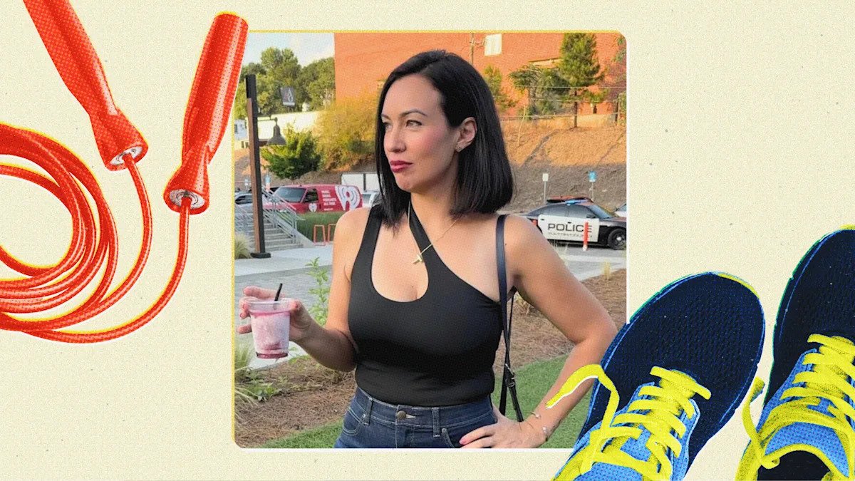 Photo illustration of Tatiana De La Rosa holding a drink, with running shoes along with a jump rope in the frame.