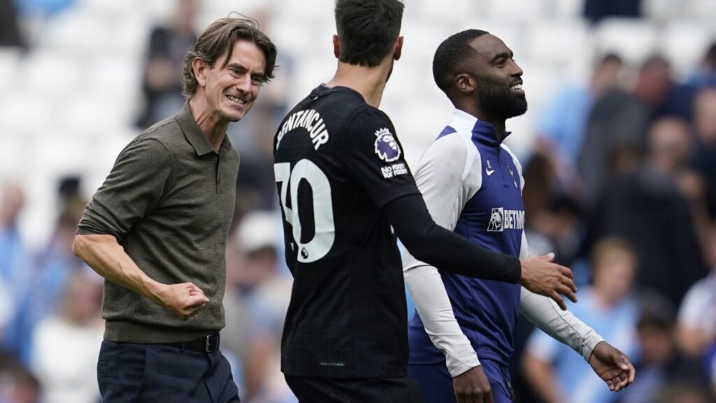 LONDON (AP) — Tottenham continued its flying start to the Premier League season under new coach Thomas Frank as Brennan Johnson and Joao Palhinha secured an impressive 2-0 victory at Manchester City on Saturday.