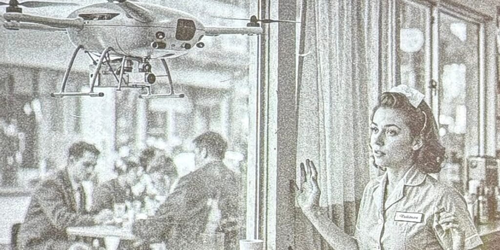Selling venture capitalists with deep pockets on the image of a pro-industrialization America seemed as important as the mission itself. Whitney Houston’s 1991 Super Bowl performance of the national anthem blasted over speakers to a packed auditorium before Phelan’s speech. The conference’s imagery blended old and new Americana: a waitress confronted with a buzzing drone, a worker riding an electric scooter, and Wyoming’s cowboys under the shadow of the Grand Tetons and a fighter jet.