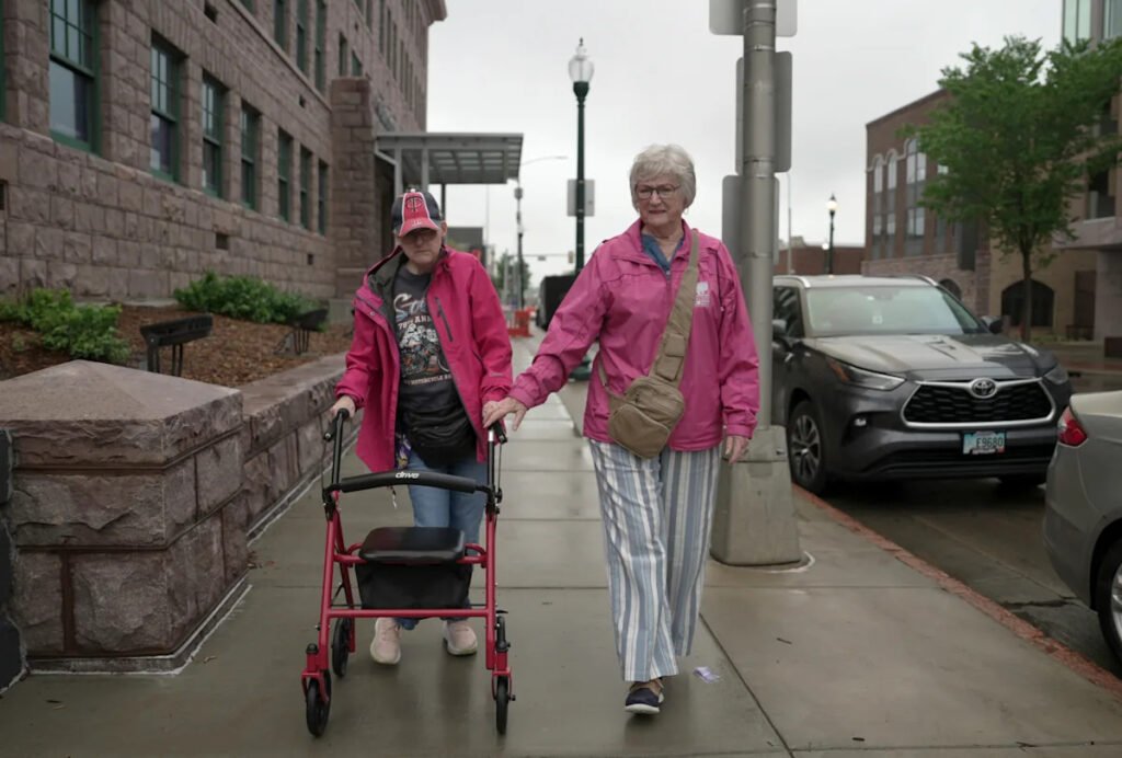 With a mother’s practiced, guiding hand, 80-year-old Janith Farnham helped steer her 60-year-old daughter’s walker through a Sioux Falls art center. They stopped at a painting of a cow wearing a hat.