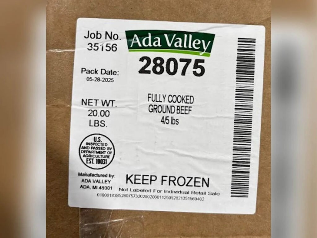 The affected items came in 20-pound boxes containing four 5-pound bags of “Ada Valley Fully Cooked Ground Beef” from specific lots — pack date May 28 with lot code 35156 and pack date May 30 with lot code 35157 — the company said. The products subject to recall also bear establishment number “EST. 10031” inside the U.S. Department of Agriculture (USDA) mark of inspection, it said.