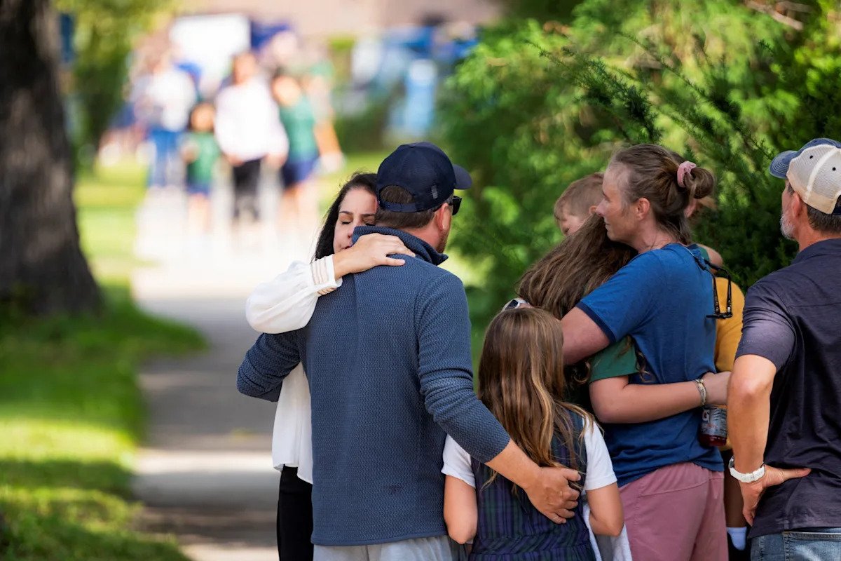 Families and loved ones reunite outside the police barricades after a shooting at Annunciation Church, which is also home to an elementary school, in Minneapolis, Minn., on Aug. 27, 2025. REUTERS/Ben Brewer