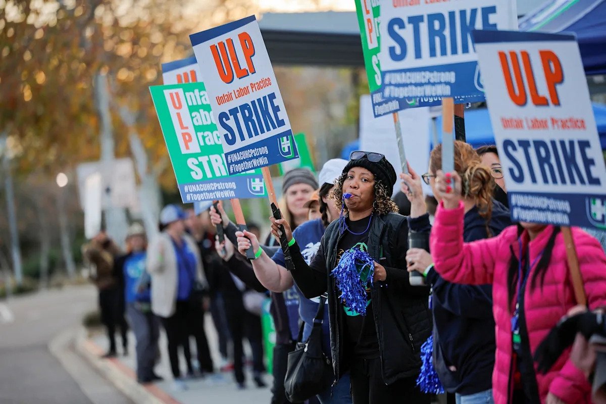 Mike Blake/Reuters – PHOTO: Striking members of the United Nurses Associations of California and Union of Health Care Professionals hold signs along the picket line outside a Kaiser Permanente hospital in San Diego, California, January 26, 2026.