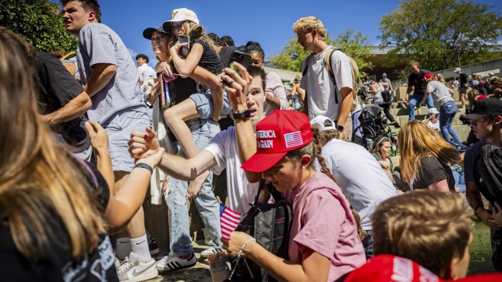 The crowd reacts after Charlie Kirk is shot during Turning Point’s visit to Utah Valley University in Orem on Wednesday, Sept. 10, 2025. (Tess Crowley/The Deseret News via AP)
