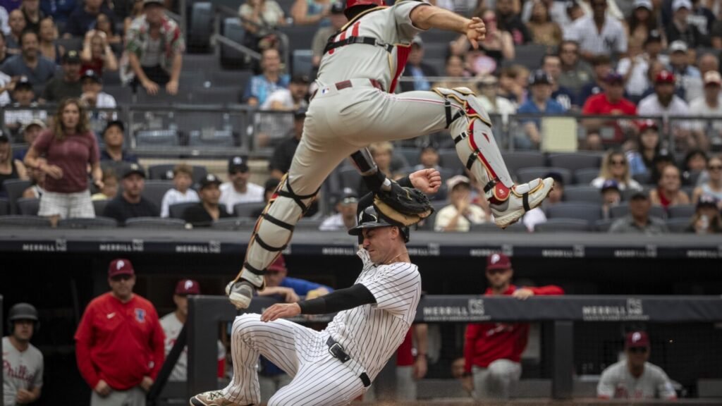 Phillies catcher J.T. Realmuto made a spectacular leaping grab and tag of Cody Bellinger at the plate for an inning-ending double play that denied the Yankees a run in the third.