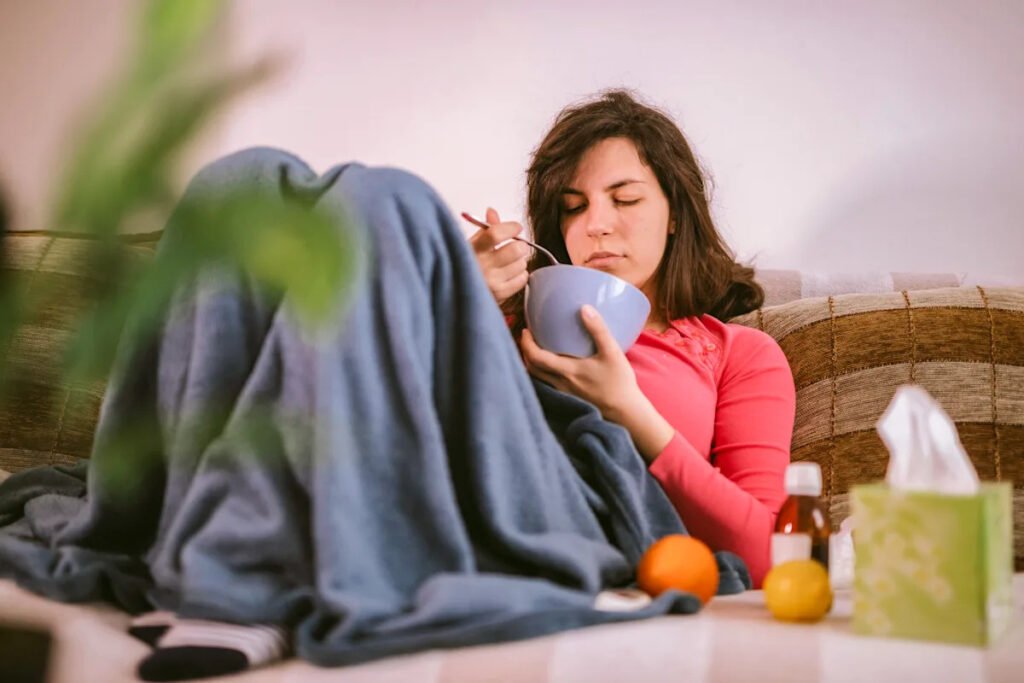– Stay hydrated. Losing water and electrolytes through sweat when you have a fever, as well as through diarrhea and vomiting, can put you at risk for dehydration, so it’s important to drink plenty of water and make sure you’re getting enough electrolytes, Gulick said. Pediatric beverages and sports drinks with added sodium and potassium can help you stay hydrated, and warm liquids such as soups, broths and caffeine-free herbal teas can help ease symptoms such as congestion, body aches and chills, Sood said. Avoid alcohol and caffeinated drinks because they are diuretics and can make dehydration worse.