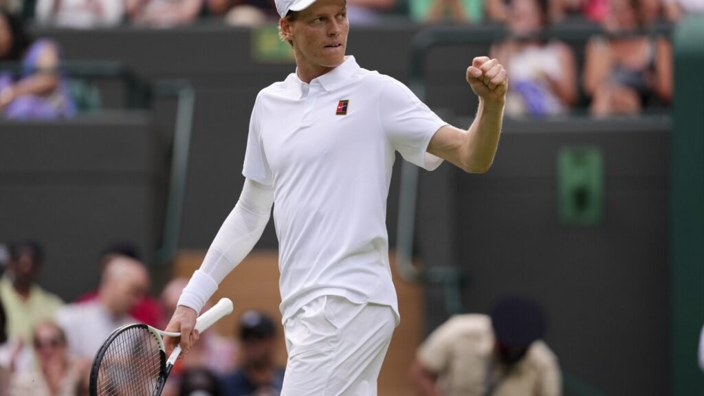 LONDON (AP) — Jannik Sinner sure didn’t play like someone dealing with an injured right elbow Wednesday, using terrific serving and his usual booming forehand to dismiss 10th-seeded Ben Shelton 7-6 (2), 6-4, 6-4 and earn a second appearance in the Wimbledon semifinals.