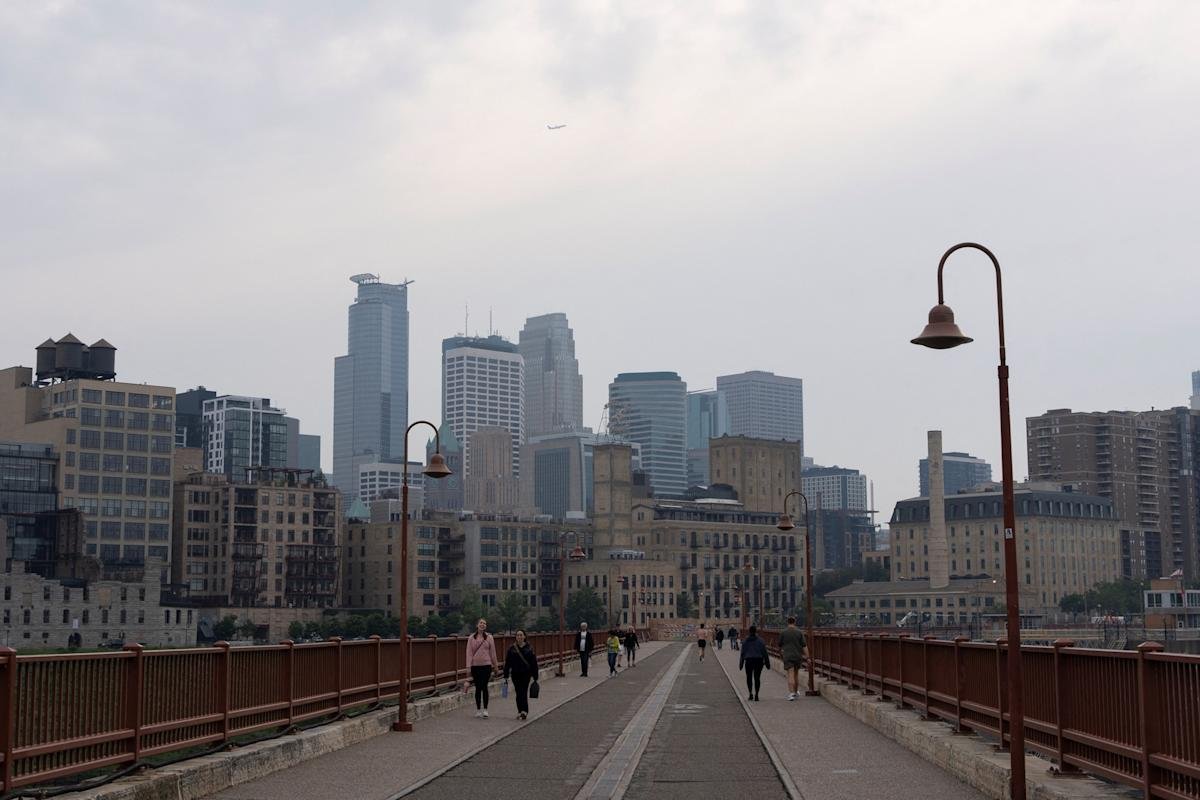 Tim Evans/Reuters – PHOTO: Pedestrians walk on the Stone Arch Bridge as a haze from Canadian wildfire smoke causes poor air quality in Minneapolis, June 3, 2025.