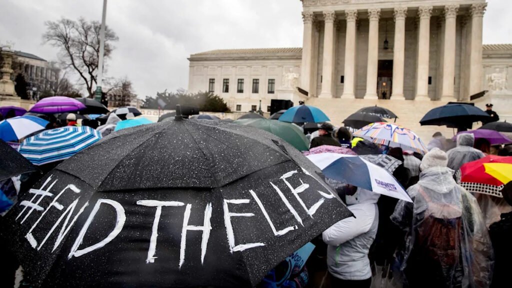 A person holds an umbrella that reads '#EndTheLies' during a rally outside the Supreme Court.