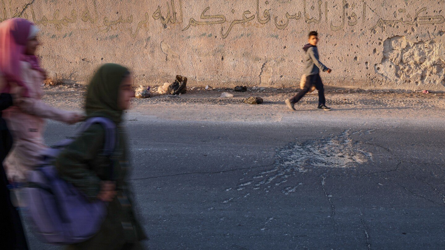 Inside classrooms, sunlight spills through gaping window frames stripped of glass. Students sit cross-legged on thin blankets spread over the cold floor, their backs pressed to the wall for support. A young girl balances her notebook on her knees, tracing the Arabic alphabet.
