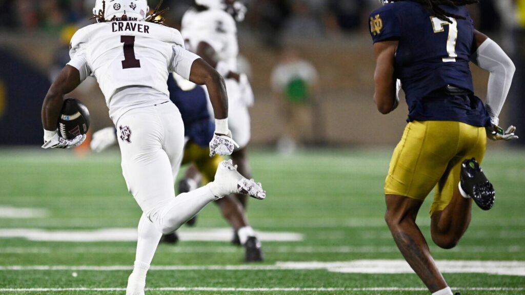 He scored the Aggies’ first points against Notre Dame when he got past his defender to make a catch at the A&M 30, broke through three would-be tacklers at the 50 and ran down the sideline to complete the 86-yard play.