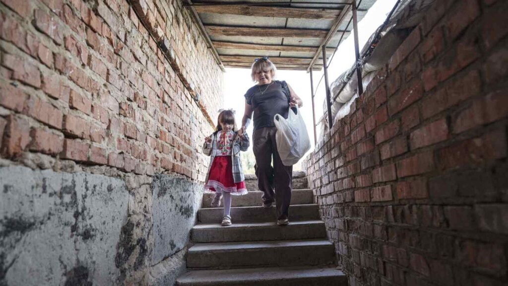 A mother walks with her daughter into the basement of a municipal building during the first day in school in Bobryk, Sumy region, Ukraine, Monday, Sept. 1, 2025. The Bobryk school was forced to move to the basement due to endless alarms. (AP Photo/Evgeniy Maloletka)