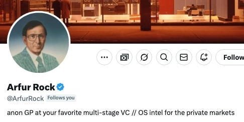 Identifying only as an “anon GP at your favorite multistage-VC,” Rock’s account is named after Arthur Rock, the iconic early Silicon Valley investor behind Intel, Xerox, and Apple. The feed is decidedly niche, with just over 23,000 followers, though it has steadily been gaining fans.