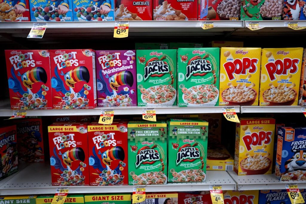 Scott Olson/Getty Images, FILE – PHOTO: In this July 10, 2025, file photo, cereal products are offered for sale at a grocery store in Chicago.