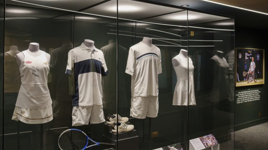 There are also autographed items from retired British stars Andy Murray, a two-time champion at the All England Club whose second career match at a major was held at No. 1 Court, and Tim Henman, a four-time Wimbledon semifinalist who played his last match at the home of grass-court tennis as a member of Britain’s Davis Cup team in 2007. Murray’s T-shirt and shorts are there, alongside Henman’s collared shirt, shorts, sneakers and racket.