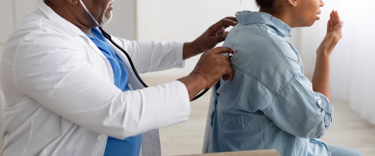 STOCK PHOTO/Getty Images – PHOTO: A general practitioner examining a coughing patient in a clinic, using a stethoscope.